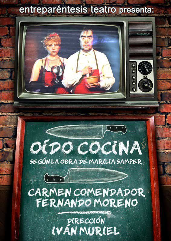 ¡Oído cocina!, basada en la obra de Menú del día de Marilia Samper (Premio Nacional Marqués de Bradomín 2002) es un texto que nos habla de los sueños, de las frustraciones, de la amistad, de la necesidad de escapar, de las limitaciones, de las ataduras, de las contradicciones, de la ilusión, de la desesperación pero sobre todo de cómo la precariedad laboral no acompaña desde luego, haciendo más difícil cambiar tu vida. El personaje de Pepa, una mujer trabajadora, casada con un hombre que no la valora, que la trata mal, Curro, un hombre atado a una madre enferma e incapaz de escapar de ella para vivir su homosexualidad libremente. Dos personajes encerrados al fin y al cabo en un sistema donde ellos entienden que tiene que ser así, que es su obligación como mujer y como hijo, pero que un día se plantean por qué no cambiar sus vidas, por qué no perseguir sus sueños, y será a raíz de un concurso en el que solo por llamar por teléfono puedes conseguir ese viaje a California y reunirte con los protagonistas de tu serie favorita , lo que hará que Pepa robe el teléfono del encargado y a partir de aquí se vaya complicando el asunto hasta llegar a una situación cada vez más extrema de la que la última escapatoria sea otro viaje muy distinto al que querían emprender. Un texto dinámico, que hace que la situación que se crea en la obra nos vaya metiendo en esa cocina y en la vida de sus personajes, y por supuesto vivir la situación límite a la que se enfrentan por perseguir su sueño. Es una divertida comedia llena de emociones, con un trasfondo social importante y un desenlace inesperado. De estar con el corazón encogido pasaremos a la sonrisa o la risa y viceversa o las dos cosas al mismo tiempo.